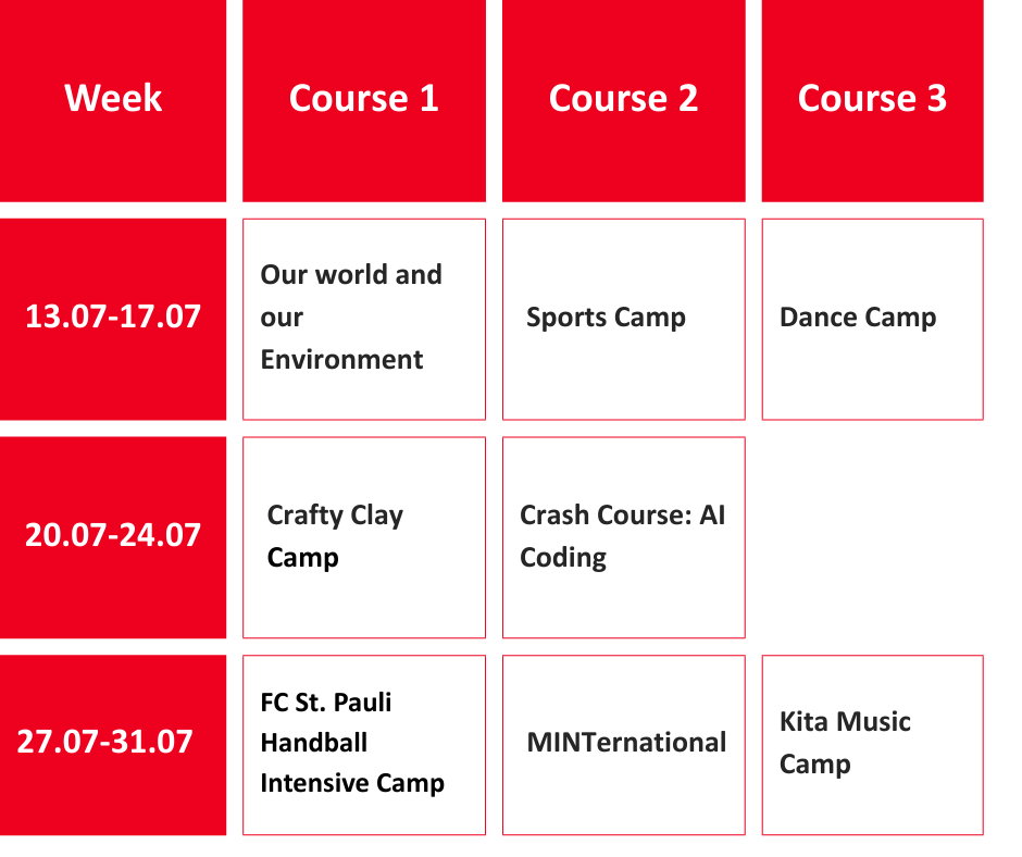 This summer, we are expanding our offerings: in addition to the regular after-school program, we are introducing a dedicated Summer Camp with specially designed programs. The camp offers 1- and 2-week courses and runs from July 13 to July 31, 2026 – a total of three weeks filled with exciting activities, learning opportunities, and shared experiences. Courses take place Monday to Friday, from 9:00 a.m. to 2:30 p.m., including lunch in the campus cafeteria for all participants. We look forward to seeing you!